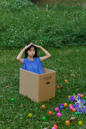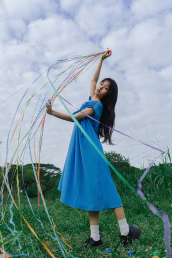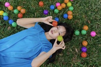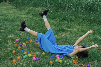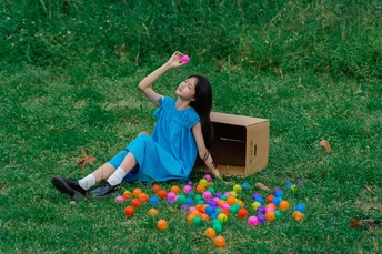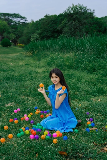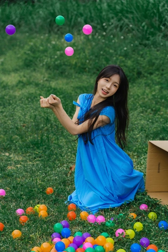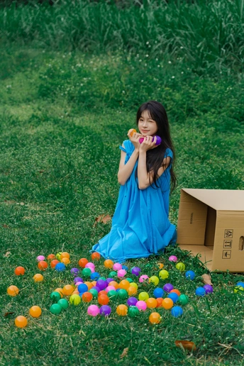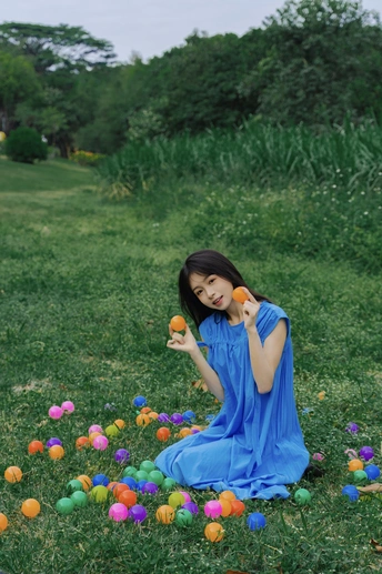 蓝裙子是画布,彩球是颜料,草地当画框 今天没做大人,只做了被阳光咬了一口的彩色梦