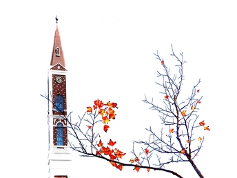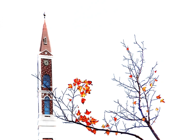 枝桠间点缀着簇簇橙红色的枫叶,暖色调的叶片与深褐色的枝干、红棕色的钟楼形成呼应,既透出秋日的疏朗,又让复古建筑多了几分灵动的氛围感。