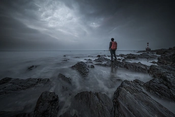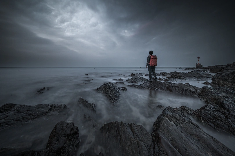 灰云压着海面,浪裹着礁石漫成一片柔雾。背包客站在湿冷的石滩上,身后灯塔像枚褪色的印章,把他的身影盖在这默片般的天地里——风是唯一的旁白,吹着未说出口的心事。