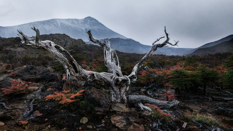 2024年4月拍摄于阿根廷巴塔哥尼亚。枯木蜿蜒于岩石之上,如大地的脉络,静静延伸向冰雪覆盖的群山。风与岁月剥蚀了它的皮肤,却也雕刻出坚韧与力量的形状。秋色在林间回荡,为这片荒原注入一丝温柔的呼吸。 Photographed in April 2024 in Patagonia, Argentina. The deadwood sprawls across the rocks like the veins of the earth, reaching toward the snow-clad peaks. Weathered by wind and time, it stands as a sculpture of endurance and strength. Autumn lingers in the forest below, breathing warmth into the wilderness.