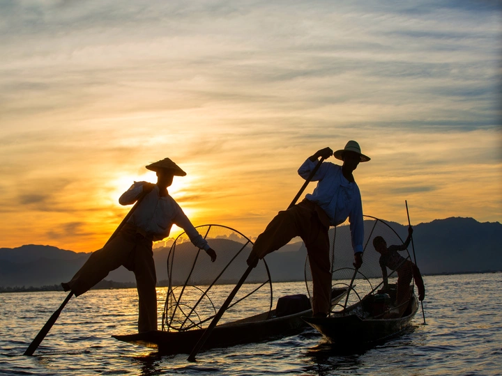 这是茵莱湖独有的渔猎文化瞬间。渔夫单脚立于狭长木船之上,身体形成富有张力的斜向线条,宛如水上舞者。渔夫的竹编斗笠与白色上衣、棕黄色裤装在逆光中形成鲜明轮廓,渔网的圆形框架与船身的直线构成几何对比,水面倒影随波晃动,整体画面通过暖色调光影与动态人物剪影,营造出原始渔猎生活的诗意与生命力。