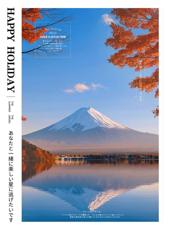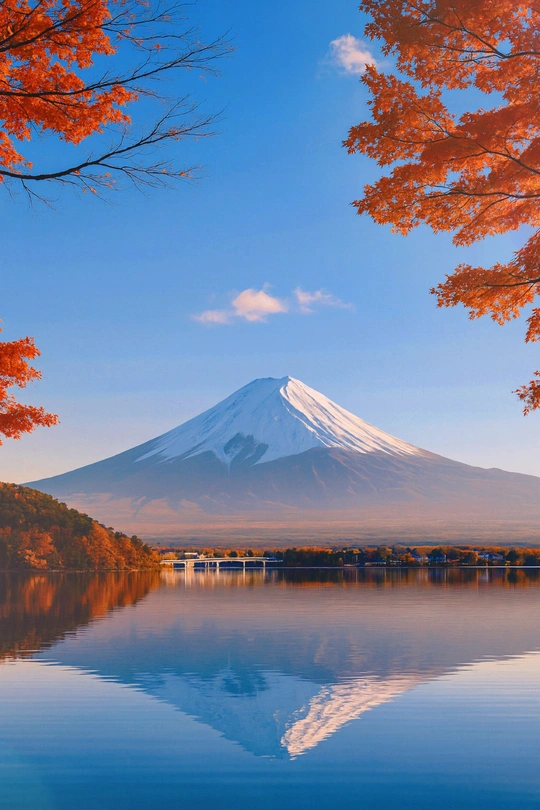 秋色正浓时的富士山,总让人心底一软。枫叶像被打翻的颜料般洒满山脚,湖面静得能听见风的脚步。山顶的白雪尚未完全褪去,在金色光影里显得格外纯净,像是一句未说完的温柔。 枫红铺满的富士时光 秋天把富士染成一首诗 落霞与枫影落在富士肩上 山在秋风里轻轻呼吸