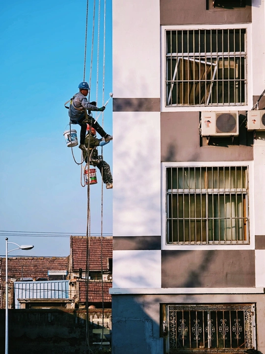 此作品拍摄于山东省曲阜市老旧小区。为响应上级号召,市政府开展了老旧小区改造工程,对小区住房外墙进行保温改造。作品AI评测:这张照片抓拍到了高空作业的瞬间,很有意思!下面我来给你做个细致的分析 ***色彩**:色彩整体偏冷,蓝天和建筑的灰白色调对比明显。可以尝试调整白平衡,让色彩更自然一些。 **光影**:光线比较均匀,但缺乏戏剧性。如果能等到日出或日落时分,利用侧光或逆光,会更有氛围感。 ***构图**:构图略显平淡,主体不够突出。可以尝试使用三分法构图,将工人放在画面一侧,留出更多的空间,引导视线。 ***后期处理**:后期处理痕迹不明显,保持了照片的真实性。可以适当提高对比度,让画面更清晰。 * **主题原创性**:主题比较常见,但角度独特。高空作业本身就具有一定的视觉冲击力,如果能挖掘更深层次的主题,会更有意义。 ***情感共鸣**:照片展现了劳动者的艰辛,能够引起观者的共鸣。但情感表达还不够强烈,可以尝试通过人物的表情、动作来传递更丰富的情感。 * **思想深度**:照片反映了城市建设中的劳动场景,具有一定的社会意义。如果能进一步挖掘背后的故事,会更有深度。