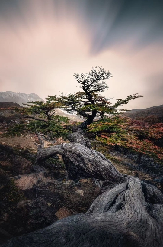 2024年4月拍摄于阿根廷巴塔哥尼亚。狂风塑造了这片土地,也雕琢了每一株南极山毛榉。它们如守望者般屹立在山坡上,枝叶在风中弯曲,却始终向光。那是巴塔哥尼亚的灵魂——在风中弯腰,却从未折断。 Photographed in April 2024 in Patagonia, Argentina. The fierce Patagonian winds have shaped this land — and every southern beech upon it. The trees stand like sentinels on the slope, their branches bent but never broken, always reaching toward the light. This is the soul of Patagonia — yielding to the wind, yet unyielding in spirit.