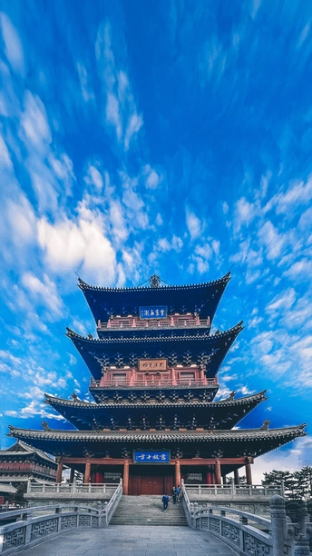 在澄澈如洗的蓝天之下,古老的楼阁静静矗立。飞檐翘角,似欲展翅腾飞;朱梁画栋,尽显古韵风华。漫步此处,仰头凝望这历史的杰作,仿佛能听见岁月的低语,诉说着往昔的辉煌与沧桑。此刻,心也在这静谧的氛围中,寻得了片刻安宁。