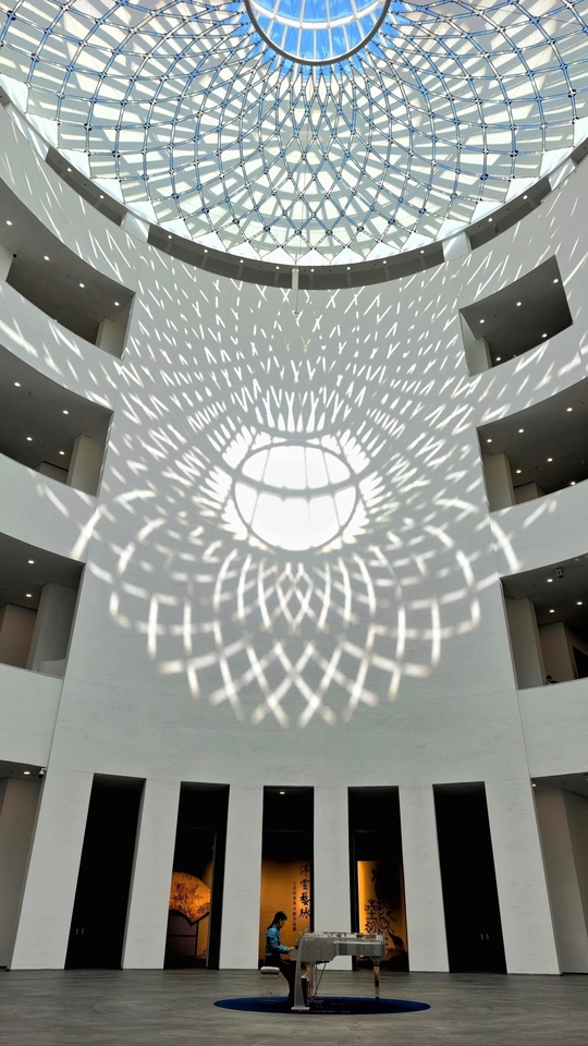 艺术馆里穹顶光影如网,倾泻在素白墙垣,勾勒几何韵律。琴者静坐光晕深处,指尖飞舞之间,琴音与光影缠揉,在空旷里织就静谧又具张力的艺术场域 。