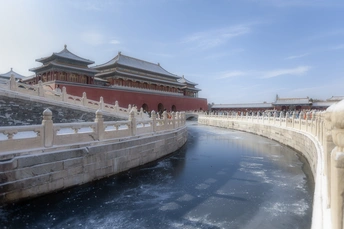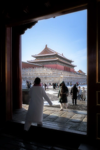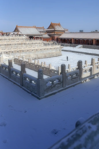 雪,似是天宫遗落的琼花,悄然铺满了紫禁城的每一寸角落。红墙如霞,在白雪的映衬下愈发深沉厚重;金瓦似金,覆上一层雪绒后更显雍容典雅。汉白玉的栏柱被雪轻裹,那些精雕的纹饰在冰雪中若隐若现,仿佛在无声诉说着六百年的沧桑。 一方庭院,积雪如毯,偶有一人走过,留下浅浅足迹,却未打破这份静谧。远处的宫殿群在蓝天的勾勒下,层次分明,雪的素白与建筑的古色交相辉映,时光仿佛在此刻凝固——昔日皇家禁苑,如今在雪的晕染中,成了一幅诗意的水墨长卷,每一处檐角、每一段宫墙,都在冰雪里焕发着别样的韵致,让人心生敬畏,又沉醉于这份穿越古今的绝美清寂。