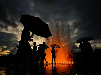 夏日傍晚,阴云密布的天空下,城市喷泉的橙红灯光在湿润地面跃动。亲子们撑伞穿梭水幕,剪影与喷泉共舞。孩子们的笑声与水珠飞溅声交织,大人们举伞护着孩子,暖光中流淌着夏日的清凉与亲情,定格成夏日里最畅快的“水幕狂欢”。
