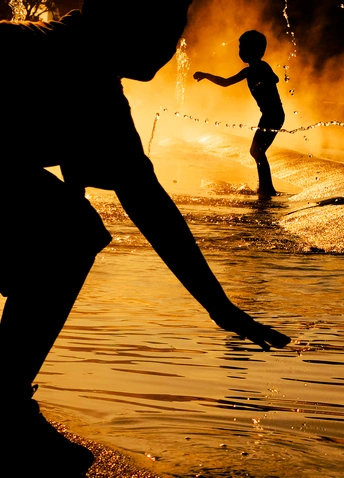 晨雾漫溢的喷泉畔,远处孩童如精灵般跃动,近处孩童俯身戏水,水雾朦胧间,巨幅剪影与微缩身影交织,恍若童话中的巨人踏入迷雾缭绕的小人国,定格童真与奇幻的瞬间。