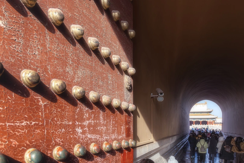朱红的宫门,金钉错落如星。岁月在漆面上刻下裂纹,却让这些门钉更显厚重。穿过门洞,是涌动的人潮,是遥想当年的宫阙。一钉一痕,都是故宫的记忆,在光影里诉说着王朝的兴衰,也见证着今人的探访,将历史与当下悄然联结。
