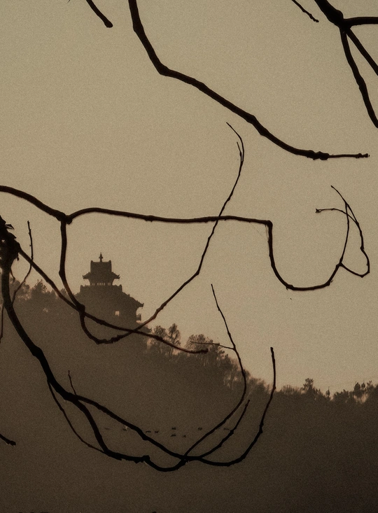枯枝如墨,交错成框。古阁静立于山巅,于斑驳光影中勾勒出时光的轮廓。黑白与暖棕的色调,是记忆的褪色与温度的留存,诉说着自然与人文在岁月里的相互守望。每一根枝桠,都是时间的画笔,每一缕光影,都是历史的低语。在这被枝叶裁剪的天地间,我们看见的不仅是风景,更是那些被岁月温柔包裹的故事故事。