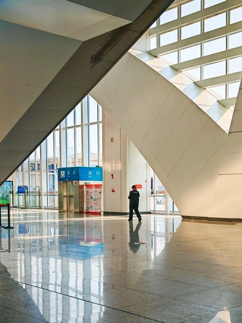 建筑结构呈现出强烈的几何美感,巨大的斜向白色结构体交错分布,搭配大面积玻璃幕墙,光线透过玻璃窗洒入,在光滑的灰色大理石地面上形成清晰的光影反射。一位身着深色制服的人员正独自行走在空旷的大厅中央,与空旷的空间形成对比,整体氛围简洁、开阔且富有现代感。