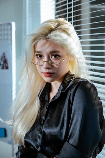 《镜中缪斯》 出镜:诸葛亮火烧盘丝洞 地点:广州 金发如瀑,镜框折射理性微光。 她在光与雾的百叶窗边, 用笔尖与镜头完成了一场温柔革命。