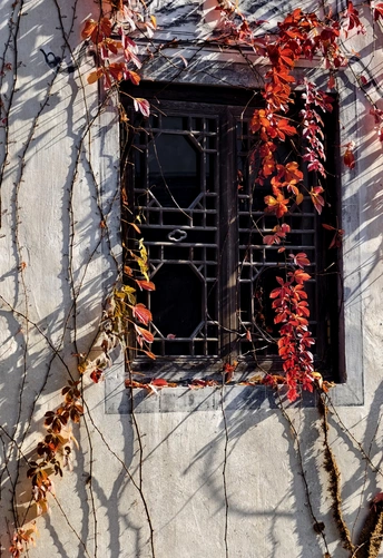 藤蔓植物在秋天呈现的红黄色彩,以及传统中式木格窗的特色,体现了自然与古建筑相融合的意境。