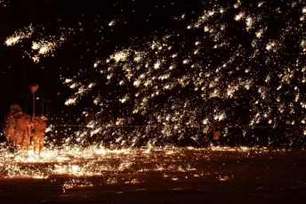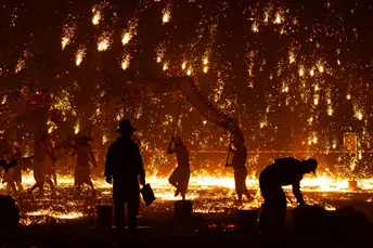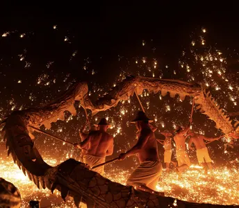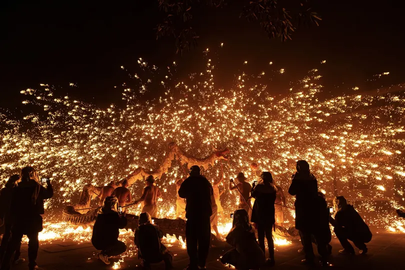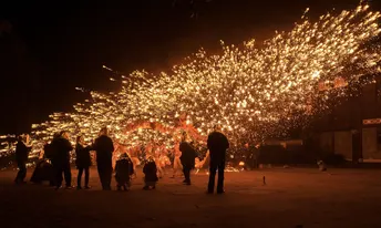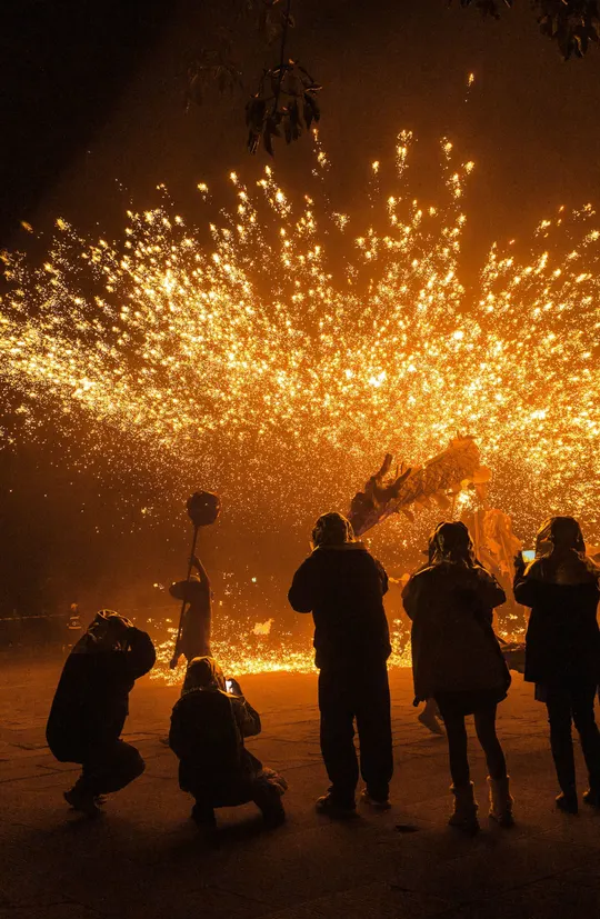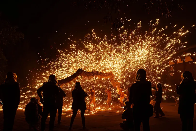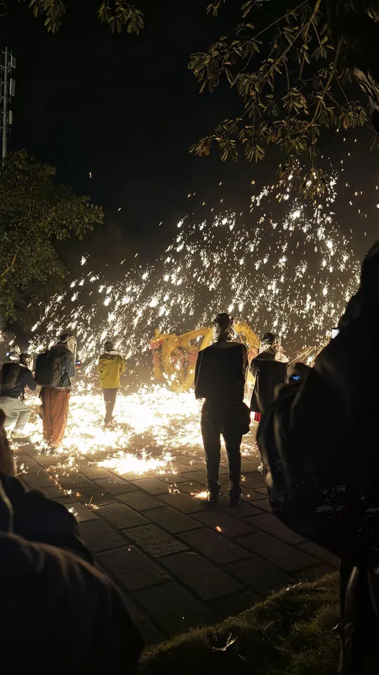 看!1600℃的铁水,在黄龙溪上空绽放成金色星河。赤龙舞火,是非遗传人写给夜空的烫金诗篇。