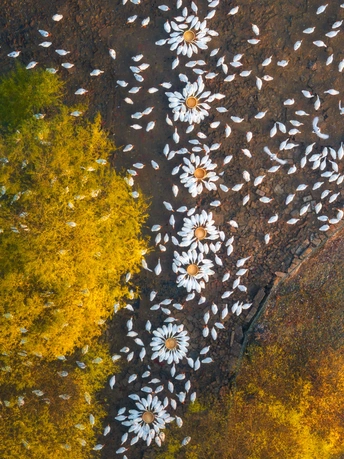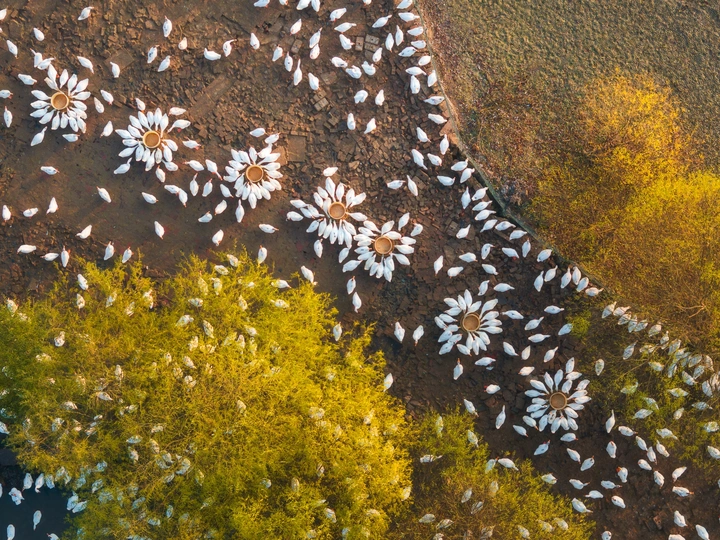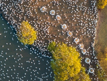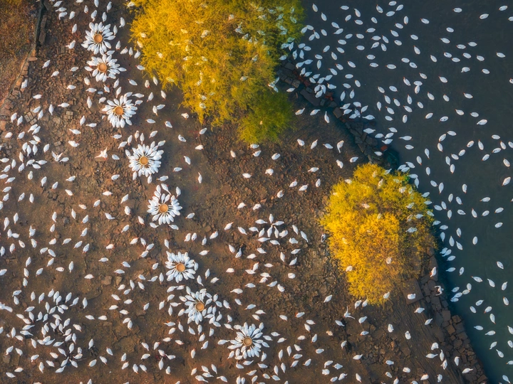 清晨一群大鹅吃食,空中看像一朵一朵小雏菊