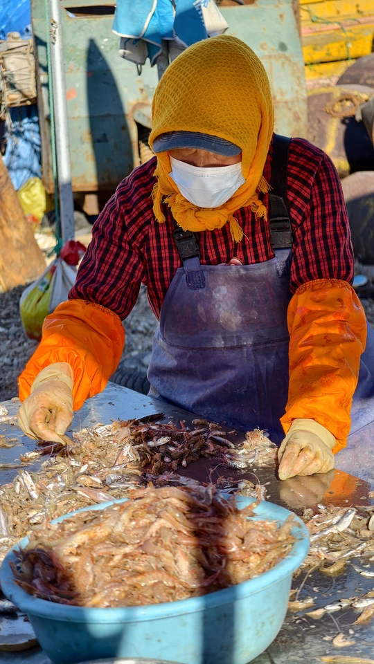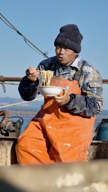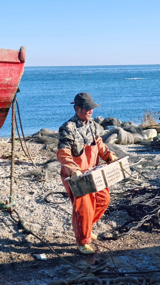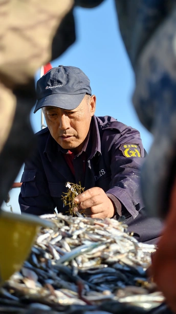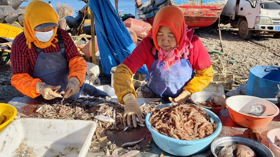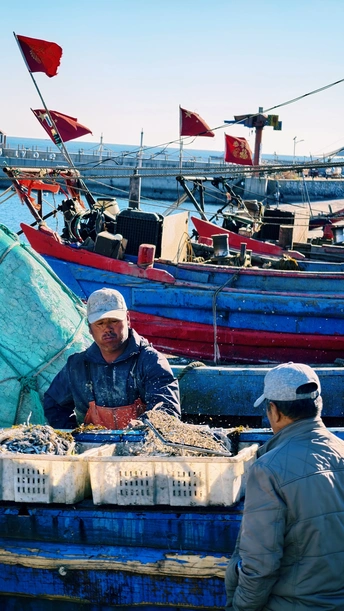 这是在2025.11.3在旅顺柏岚子渔村用手机抓拍的,渔民打渔归来的场景。船靠暗了,先举手示意,开始缷船,一箱子一箱子往下搬,渔民出海没来得及吃饭,归来吃点面条继续干。他们基本上都是家人承包,开始分捡,人手不够,连保卫的亲属都上,把大小鱼虾分开,有的鱼就嗮成干再售。 这是一组手机原图直出作品。 @米拍 @米拍社长 @米拍小助手 @米拍编少