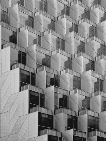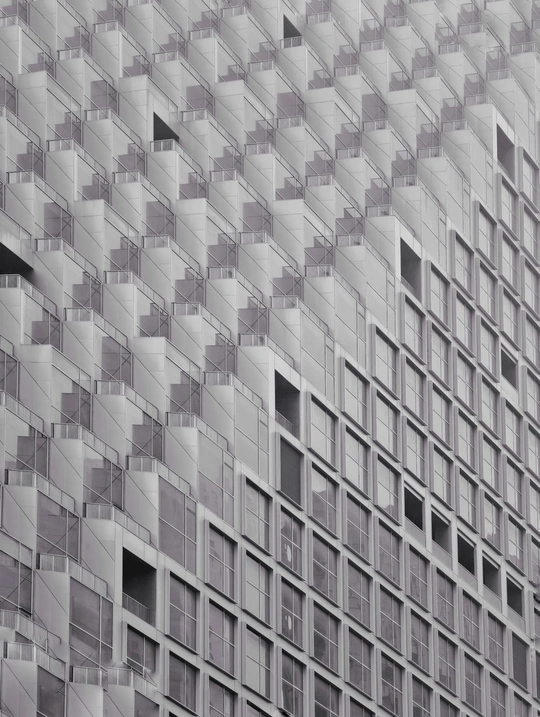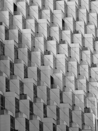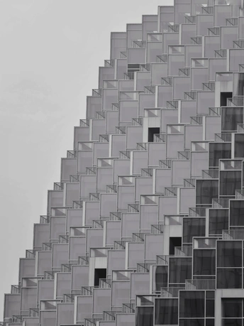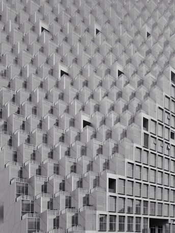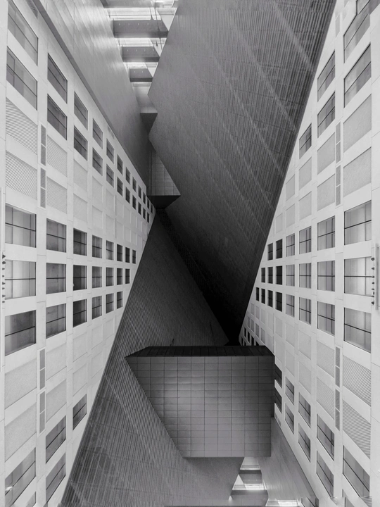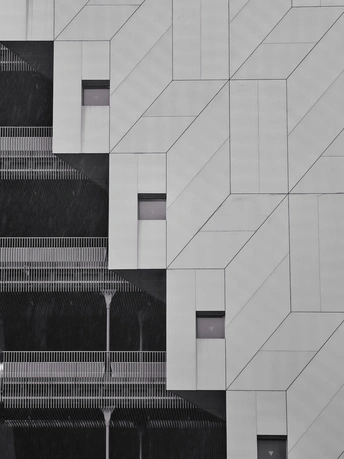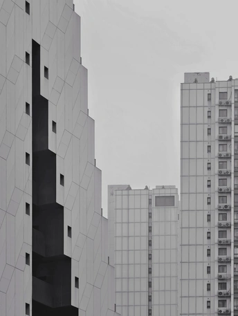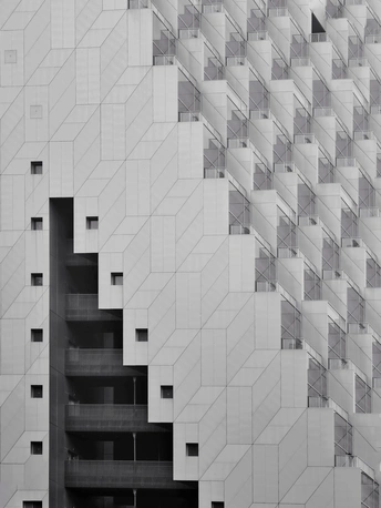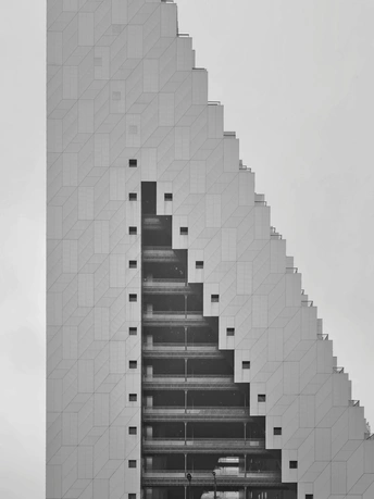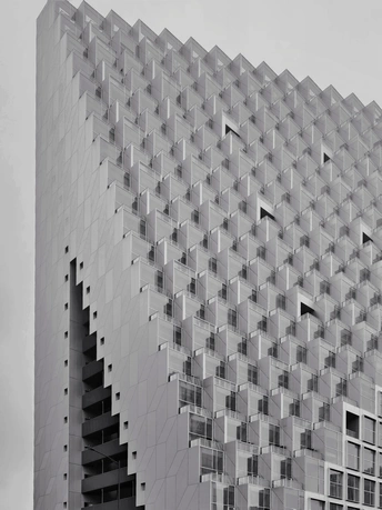 建筑的轮廓被几何切割成细密的矩阵,菱形与多边形的表皮如鳞甲般层叠,在灰调的镜头里,硬朗的线条勾勒出建筑的骨骼。光与影在凹凸的肌理间游走,镂空的窗洞如墨渍般在白色立面晕开,形成错落的视觉节奏。镜头下的建筑不再是冰冷的混凝土体,而是由几何秩序编织的视觉迷宫,每一块板材的拼接、每一处角度的转折,都让建筑的理性之美在黑白灰的层次里,绽放出棱面折射的冷冽光芒。