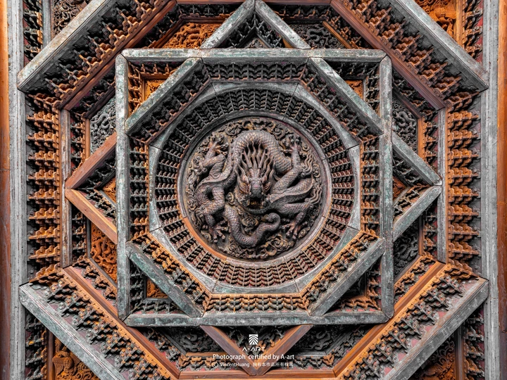 拍摄于北京古代建筑博物馆:拜殿-蟠龙藻井:金丝楠木雕刻五爪金龙,栩栩如生的蟠龙造型,每片龙鳞都清晰可见,令人叹为观止。