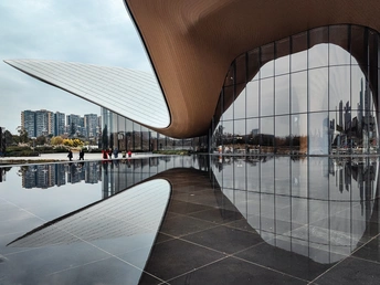 构图以“双曲面对称”构建视觉交响:前景水面如镜面切割天地,建筑的木质弧顶与金属翼片在水中形成完美倒影,构成上下对称的“∞”符号。摄影师采用低角度仰拍,让悬挑的白色翼片如折纸般划破灰蓝天空,玻璃幕墙的垂直线条与远处矩形高楼形成几何对话,而渺小的人影成为连接宏观建筑与微观生活的黄金分割点——这种“人工与自然、直线与曲线、实存与虚像”的三重平衡,让静态画面生出流动感。 色彩是材质的低调叙事:原木色的温暖肌理、金属翼片的冷白光泽、玻璃幕墙的深灰反光,在阴天的柔光下达成莫兰迪色系般的和谐。最点睛的是穿红衣的行人,如一滴朱砂落于水墨长卷,既打破冷色调的疏离感,又强化了“建筑为人存在”的本质。倒影将色彩重复叠加,使木质的暖棕与玻璃的冷灰在水面交融,形成“实体-镜像”的色彩蒙太奇。 情感藏在“刚柔相济”的矛盾里:建筑的金属翼片似利剑出鞘,木质弧顶却如丝绸垂落,这种“力量与温柔”的碰撞,暗合现代人对空间的双重渴望——既需要理性的秩序感,又向往感性的流动美。水面倒影的轻微波纹,则为硬朗的建筑注入呼吸感,仿佛冰冷的玻璃幕墙也开始柔软地呼吸,让观者在宏大结构中找到心灵的栖息点。 主题是“城市与自然的和解”。
