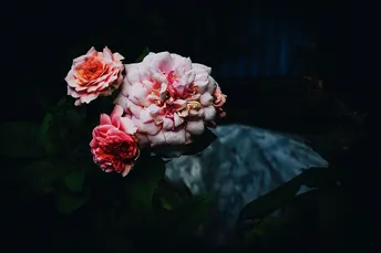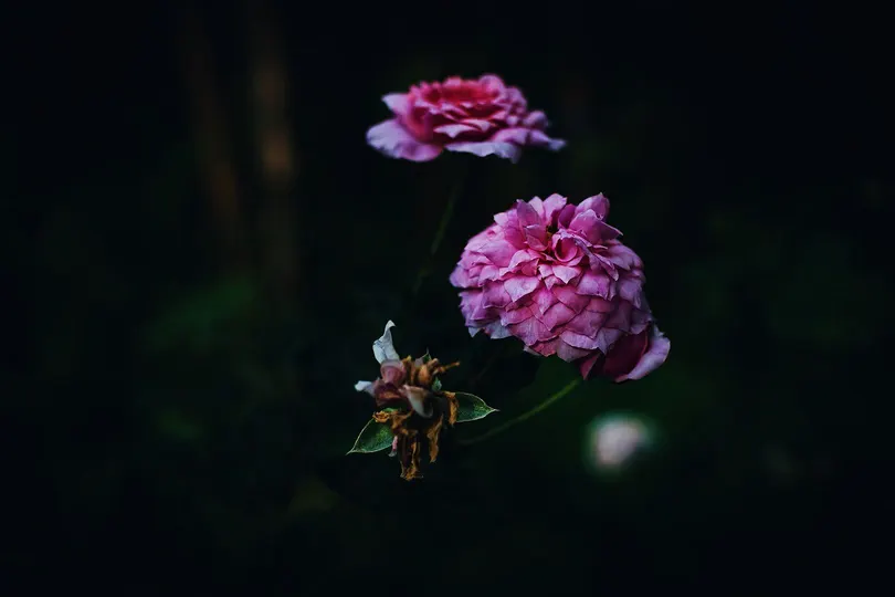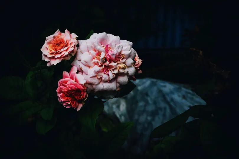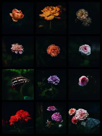 在暗色背景的衬托下,月季与蝴蝶肆意绽放。不同色彩、形态的花朵,是自然写就的浪漫诗行,每一朵都藏着独属于自己的温柔故事,邀你共赏这份暗夜繁花的静美。