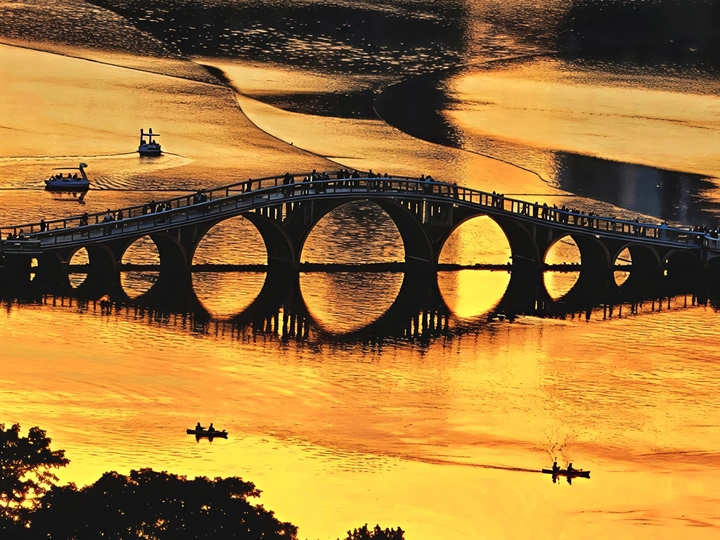 在这温柔的黄昏时分,湖面被染成了绚丽的金黄。两对小船悠悠地漂浮在波光粼粼的水面上,仿佛是在这金色画卷中悠然漫步的行者。