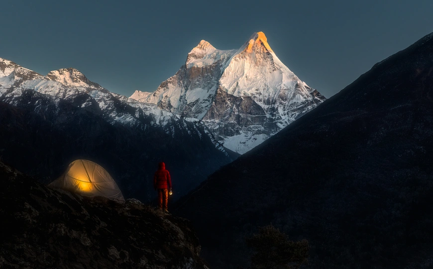 夜色进入山谷。帐篷与灯光照亮停留之处,远处乔格茹峰正逐渐淹没在夜色中。 本作品拍摄于西藏日喀则市定日县绒辖沟陈塘村一带,为地面拍摄。远处雪峰为乔格茹峰(又名门隆则峰,Melungtse),海拔 7,181 米,属喜马拉雅山脉中段的重要雪峰。从陈塘村方向观察,乔格茹峰常呈现出独特的“双峰并列”轮廓,因峰顶结构与光影关系,被形象地称为“猫耳朵”形态。清晨时分,低角度日光切入雪壁,使山体结构被清晰显影,而峰顶云层的停留进一步强化了这种视觉特征。在无人机禁飞的条件下,地面视角反而强调了人与山之间的距离,使雪峰不再是俯瞰的对象,而是被仰望、被等待显现的存在。