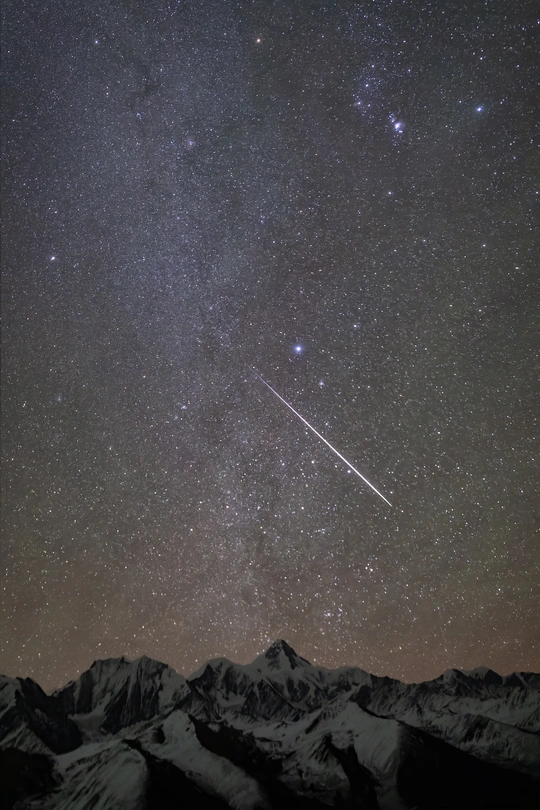 构图以“天地对话”构建宇宙剧场:深邃夜空如泼墨宣纸,银河从左上角倾泻而下,形成自然的S形曲线,将亿万星辰织成流动的光河。画面底部,雪山群峰以剪影形态横向展开,棱角分明的山脊线与星空的柔曼形成刚柔对峙,而那道斜穿画面的流星,则如神来之笔,将“天-地-光”三者串联成黄金三角——这种“宏观秩序中藏着偶然之美”的构图,让静态画面生出时空流动感。 色彩是宇宙的低饱和叙事:墨蓝夜空从穹顶到地平线渐变为暖紫,银河的银白与淡粉如晕染的水彩,雪山的灰黑剪影沉淀着大地的重量,而流星的亮白轨迹则像突然划破画布的刀锋。没有明艳色块,却通过“深蓝-银白-赭石”的渐变,呈现出宇宙从冷寂到温暖的呼吸节奏,让观者在暗色调中感知星辰的温度。 情感藏在“永恒与刹那的悖论”里:亿万星辰构成的静态星图象征时间的永恒,转瞬即逝的流星却代表生命的短暂,雪山的亘古沉默与流星的转瞬即逝在此碰撞,引发观者对“存在与消亡”的哲思。最动人的是流星轨迹的弧度——它不偏不倚地落在银河与雪山之间,仿佛是宇宙写给人类的一封短笺,短暂却璀璨。 主题是“人类在宇宙中的位置”:当雪山的巍峨在星空下显得渺小,当流星的短暂在星图前成为注脚,暗喻人类觉醒。