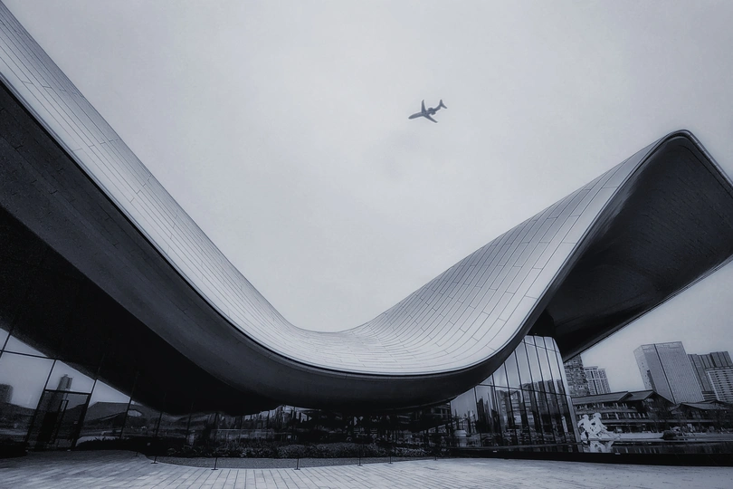 构图以“流动的几何”重构空间逻辑:建筑的S形曲面如被风吹起的金属绸带,从左下角延伸至右上角,形成贯穿画面的黄金分割线。玻璃幕墙反射的城市倒影与实体建筑构成虚实叠印,而空中的飞机恰好落于曲线顶点与右侧建筑的留白处,成为“人工造物对话”的视觉锚点。这种“大弧度曲线+小尺度飞机构成”的设计,让工业美学与自然韵律达成微妙平衡。 色彩在黑白灰中完成情绪叙事:建筑的金属银灰从高光到阴影呈现16级灰度渐变,玻璃的镜面反射将天空的雾白与地面的深灰压缩成平面,飞机的剪影则是纯粹的黑色标点。没有色彩干扰,反而让观者聚焦于材质本身的肌理——金属的冷硬、玻璃的通透、天空的朦胧,共同编织成工业时代的视觉史诗。 情感藏在“刚柔相济”的矛盾美学中:建筑的巨大体量本应带来压迫感,却因流畅的曲线消解为轻盈的漂浮感,仿佛下一秒就会随风起飞。飞机的偶然闯入强化了这种想象,让冰冷的钢筋混凝土突然有了呼吸,引发观者对“重量与轻盈”“束缚与自由”的哲学共鸣。 主题是“人类对自然形态的永恒模仿”:建筑的波浪形屋顶呼应云层的流动,金属板的鳞片状排列暗合鱼类的肌理,而飞机作为“人造飞鸟”,则完成了“模仿自然—超越自然”的闭环。