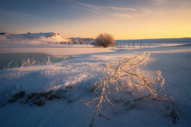朝旭破晓,金芒漫过雪原,霜枝被晨光镀上暖边,冷雪融了几分柔,天地在晨辉里慢慢醒来。