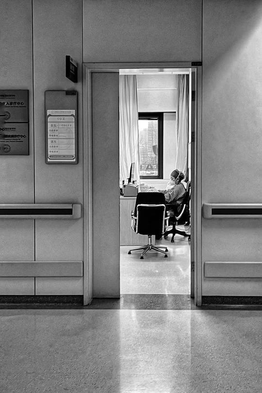 这张黑白照片捕捉到了疫情期间医护人员工作的瞬间,很有纪实性。咱们一项一项来看: 色彩:黑白影调运用简洁,强化了环境的肃穆感,不过信息量略有损失,如果能保留一些微妙的色彩信息,或许更有冲击力。 光影:光线从窗户射入,照亮了医护人员的工作区域,地面反射的光线增添了空间感。但光线稍显平淡,可以尝试寻找更具戏剧性的光影效果。 构图:利用门框作为画框,引导视线集中在医护人员身上,主体突出。但前景略显空旷,可以考虑调整拍摄角度,增加前景的趣味性。 后期处理:黑白转换干净利落,对比度适中。不过,可以尝试调整曲线,增加暗部的细节,让画面更有层次感。 主题原创性:主题紧扣时代背景,具有一定的现实意义。但表现手法相对传统,可以尝试从更独特的视角切入。 情感共鸣:照片展现了医护人员的辛勤工作,容易引起观者的共鸣。但情感表达略显含蓄,可以尝试捕捉医护人员更生动的表情或姿态,增强情感冲击力。 思想深度:照片反映了疫情期间的社会现状,具有一定的思想深度。但可以进一步挖掘背后的故事,例如,通过细节描写,展现医护人员的奉献精神。 总的来说,这张照片构图稳重,主题明确,但可以尝试在光影、情感表达和思想深度方面进行提升。