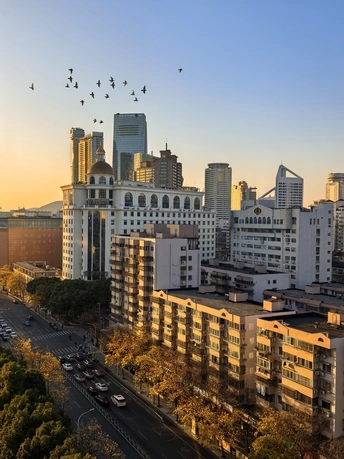 傍晚时分的阳光洒在这条街道上,街道两边的鹅掌楸叶子也正黄,附近大爷养的鸽子在城市上空盘旋。