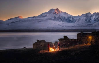 傍晚的佩枯措一半沉入蓝调,希夏邦玛峰的山脊却被最后的霞光点燃。冰冷的湖风吹过石墙遗迹,篝火在风里跳动,照亮了两个人的身影——在雪山与湖之间,人间的温度短暂却坚定。