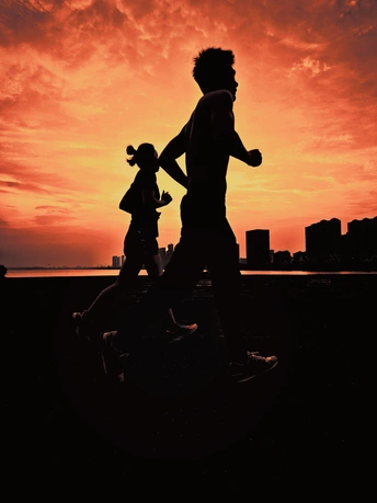 晚霞把天空烧作火的海, 他们是浪尖跃动的鱼, 影子在地面洇开, 与脚步一同 敲打着 黄昏的节拍。 城市在身后矮成剪影, 呼吸混着风的气息, 每一步, 都是把这炽热的光, 揣进 生命的 行囊里。