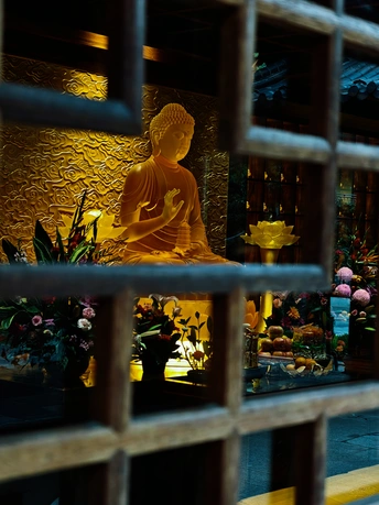 木格窗裁出一方圣境, 金身佛端坐着, 手结印, 似在拈花, 又似在渡人。 烛火跳着暖的光, 花果供着俗的愿, 花香与檀香缠在一处, 透过格子, 把尘心 轻轻拢进 这静的 慈悲里。