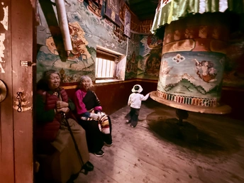 当我独自走进理塘一座安静的小转经房,本想歇歇缓解一下高反,巧遇一位藏族老人带着孩子也在转经,老人坐在角落里歇息,小女孩拼尽全力的推着巨大的经轮。这份虔诚感动了我,悄悄记录下这感人的瞬间。