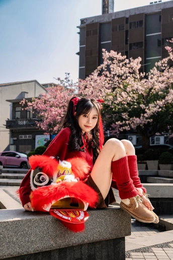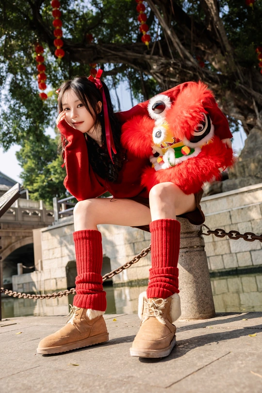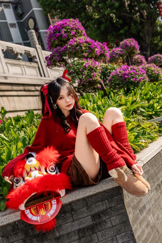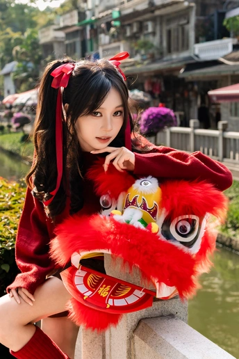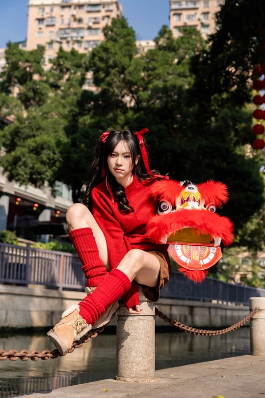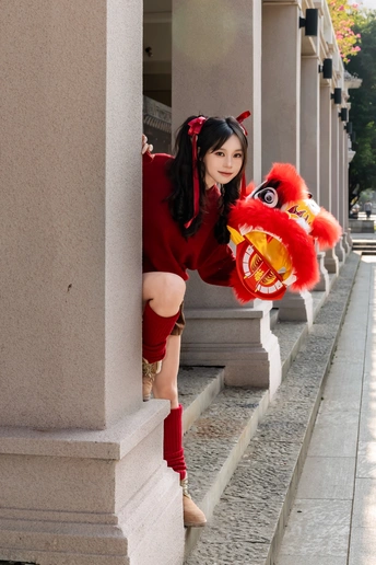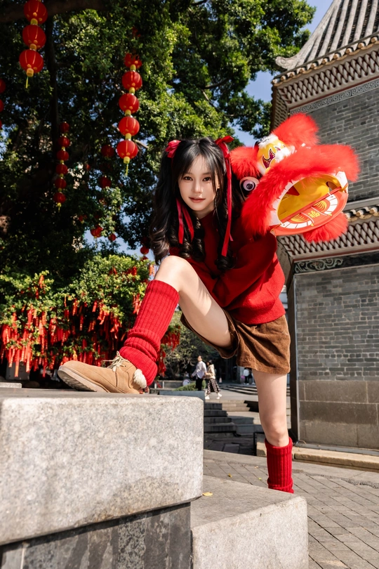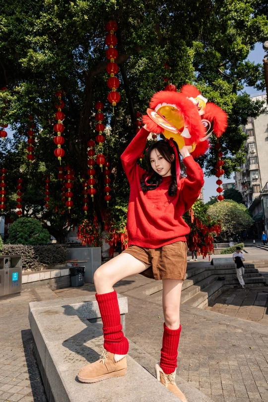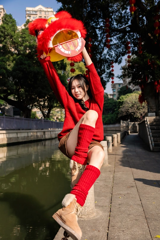出镜:茵子 地点:广州荔湾湖公园文塔 她以一身明艳红装穿行于石桥古巷,手执金鬃狮头, 在花树与灯笼的映衬下,将新春的欢愉定格为一场与时光共舞的青春叙事。