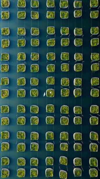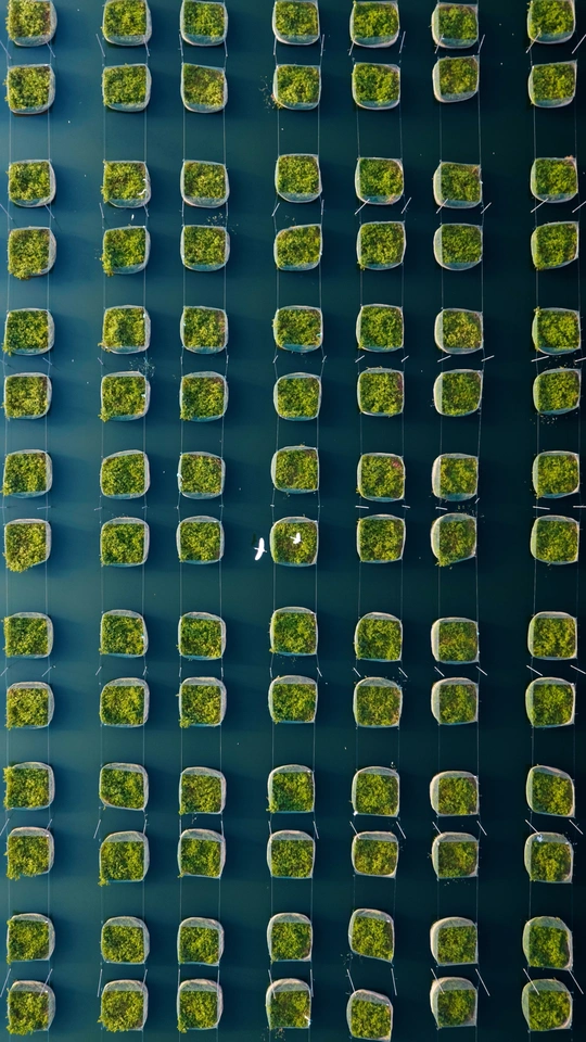 位于武汉江夏的水上养殖场,吸引来觅食的水鸟,白色飞鸟在绿色的方块草垛中穿梭。自然与现代农业在此交融。
