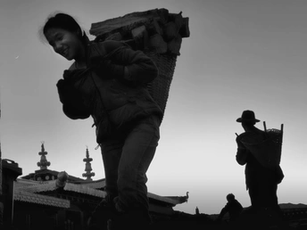 月光倾洒,一个纤细的身影在月光下缓缓前行。女孩背着竹筐,装满了月光与静谧,身后不远处。戴礼帽的男人静立着,身形挺拔,礼帽的轮廓在月光下格外清晰,诉说着一段不为人知的故事。