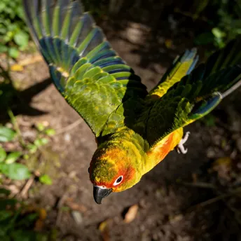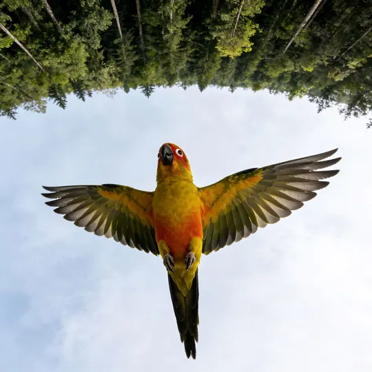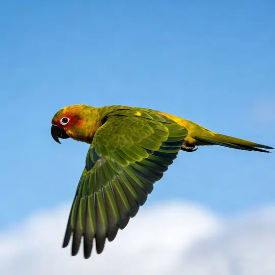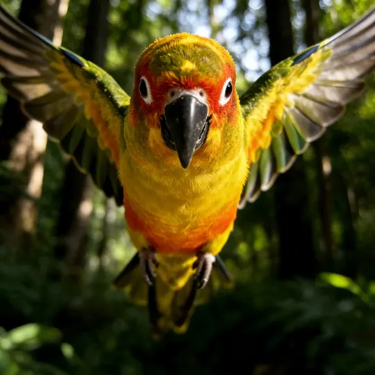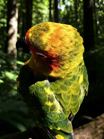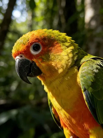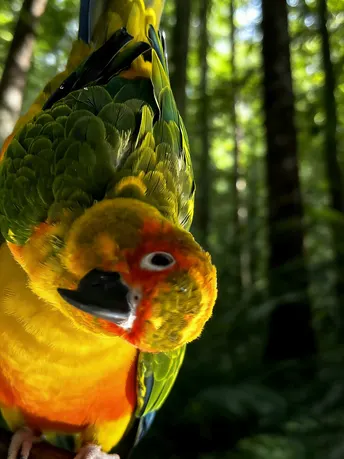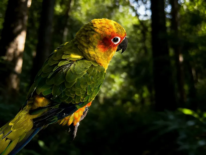 暖金揉碎了秋阳,晕染在鹦鹉的羽尖,橙红的颊羽似燃着细碎的焰,墨黑的喙勾住一方天光。它立在石面,爪尖扣着清冷的纹路,眸光里盛着未驯的灵动;若振翅而起,那抹斑斓便会划破长空,把平凡的石径,化作它舒展羽翼的天地。方寸石间是安然的栖居,振翅之时是凌云的自由,这小小生灵,竟把温柔与洒脱,都揉进了一身华彩。