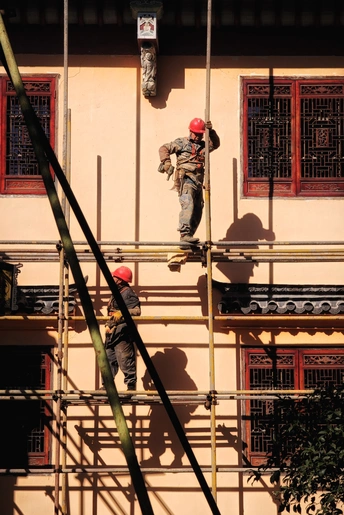 两名工人戴红盔、着工装,在古建脚手架上作业,光影交织下,尽显传统建筑修缮中的劳作之美。