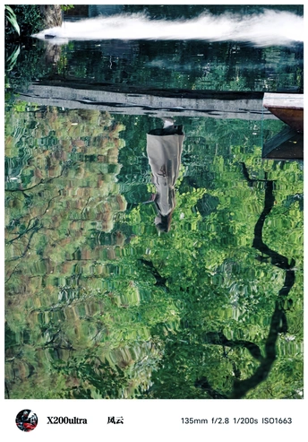 水面倒映着葱郁绿树与行人身影,波光粼粼间虚实交融,如梦似幻。水边石阶静默,上方白雾轻拂,构成一幅诗意盎然的自然画卷。