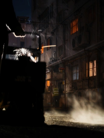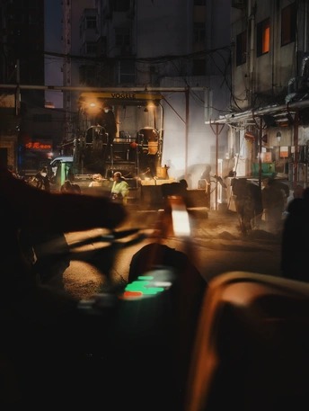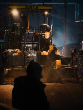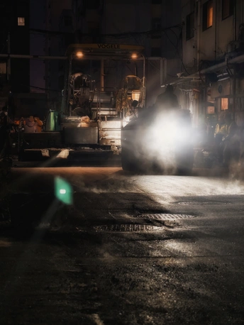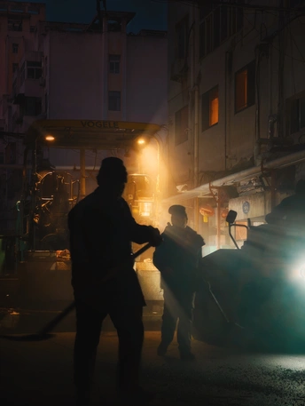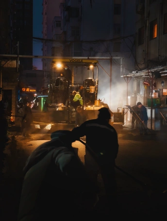小区里面这几天在铺设柏油路面,夜幕下,机器的灯光,蒸腾的地面,忙碌的身影交织在一起,还有那么一些科幻的错觉!