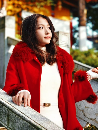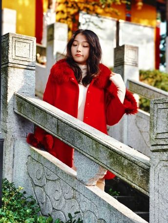 朱砂红大衣拂过青石阶,黄墙古寺的禅意漫上肩头,风穿过雕栏,把东方的雅致揉进这一帧光影里。