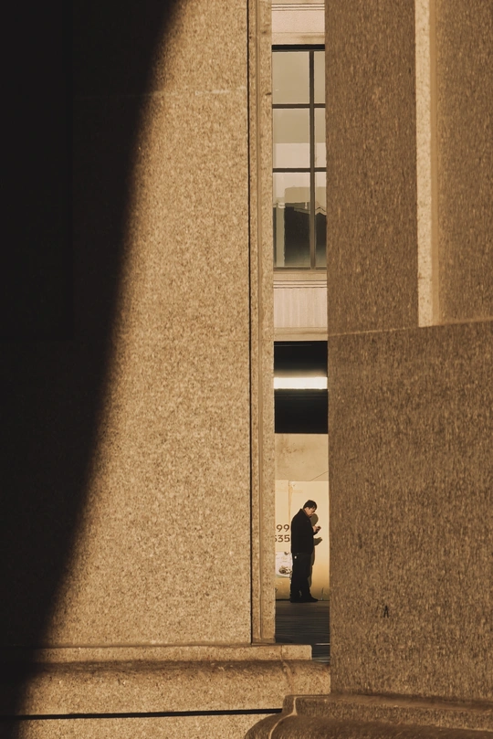 暖黄光线洒在石质建筑间,一道缝隙中,人影静立专注于手中事物,空间与光影交织出静谧的都市片刻。