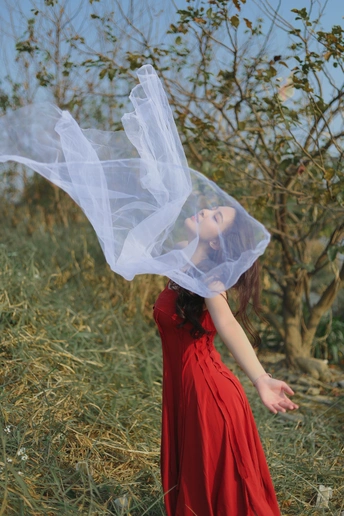 拍摄时间于2025年2月份,地点在广州大学城的其中一个枯枝荒野林间,当时配合风力让白纱飘起,连拍捕捉白纱不同的飘动形态,从抓拍的图片中筛选了这张半遮挡画面,营造朦胧的情绪感,突出“自由与舒展”,通过模特放松的体态、白纱的肆意飘飞,表达人与自热相融的松弛感。