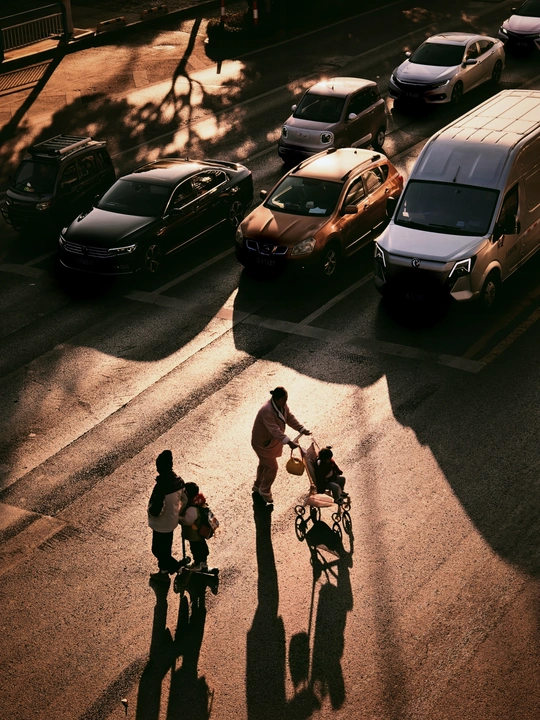 在午后倾斜的光线中,城市的街道成了一条静谧的河流。左侧,一位父亲微微侧身,目光紧随那个踩着滑板的少年——他的身影已显露出独立的轮廓,滑板滚动的轨迹如同即将展开的人生航线。右侧,一位母亲轻推着婴儿车,车中的幼童正凝望着世界,稚嫩的手掌仿佛还在捕捉光的形状。 两对母子在街角短暂交会,并未停留,却像时光本身完成了一次无声的对话。滑板少年向前冲去的惯性,与婴儿车平稳向前的缓慢,在此刻构成了生命不同阶段的隐喻:一边是挣脱守护的试探,一边是全然依赖的温柔。而父母的身影,一个已学会放手目送,一个仍躬身推动——他们恰似时间的两个侧面,在擦肩的瞬间,完成了关于爱与成长的接力。 这幅画面没有对视,却充满了凝视。它拍下了每个人都曾经历或终将抵达的瞬间:我们都在同一段街道上,先后成为被推着的人、推着的人、放手的人。街道是共同的,方向却各自延伸,唯有爱是这条航道上永不偏移的坐标。