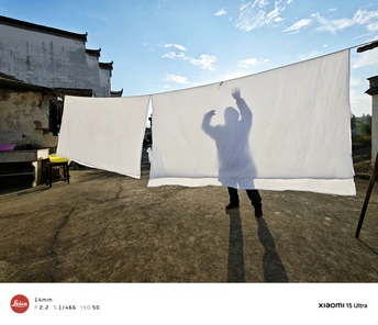 在古朴的院落空地上,两块洁白的布被晾晒在绳上,蓝天为幕,老屋作景。一个正在晾晒床单老人的影子俏皮地映在白布之上,姿态生动,充满了生活的趣味与艺术的巧思。