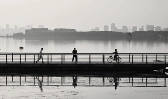 晨雾漫过湖面,将城市的轮廓揉成一片朦胧的水墨。长桥横卧在水波之上,铁栏的线条在晨色里拉成笔直的影,与水面的倒影交错成框。 桥上的人是这帧画面里鲜活的注脚:晨跑者的脚步敲打着桥面,带起一阵轻扬的风;伫立的身影凝望着湖雾深处,似与这晨景相融;骑行者的车轮碾过石板,轨迹在晨光里轻描淡写地划过。 他们的身影被晨雾滤去了细节,只余下简洁的轮廓,与湖、桥、雾一同,酿成了清晨最温柔的模样。时光仿佛在此刻慢下来,所有的步履都成了晨影里的诗,在湖光与桥影的相拥中,轻轻流淌。