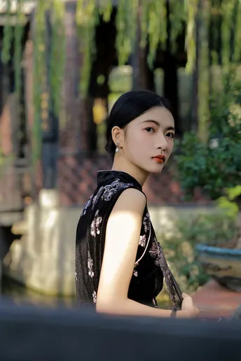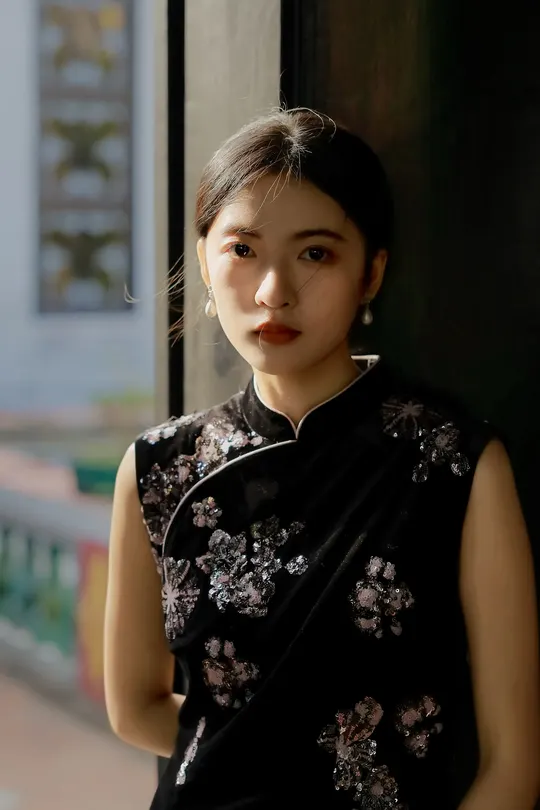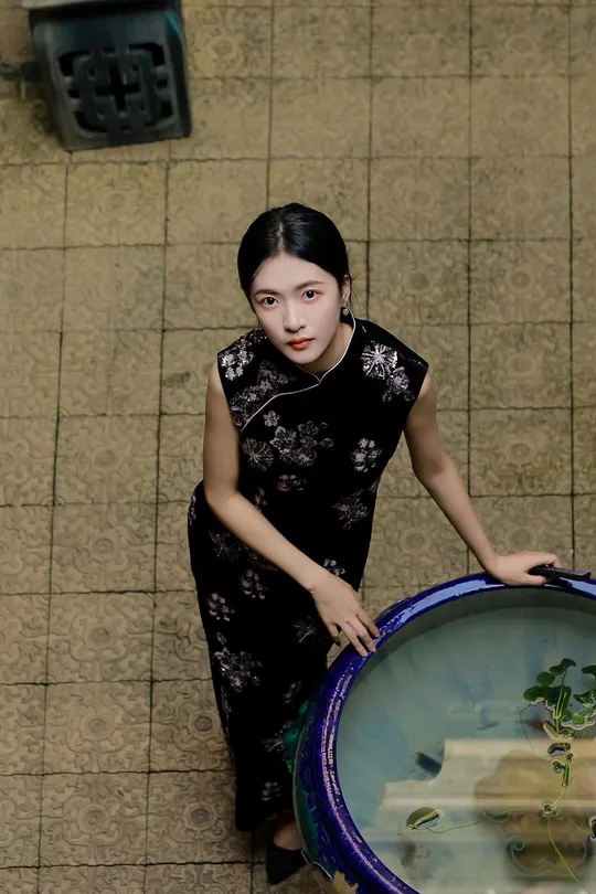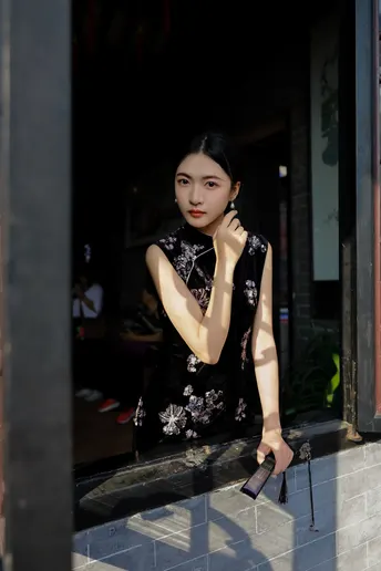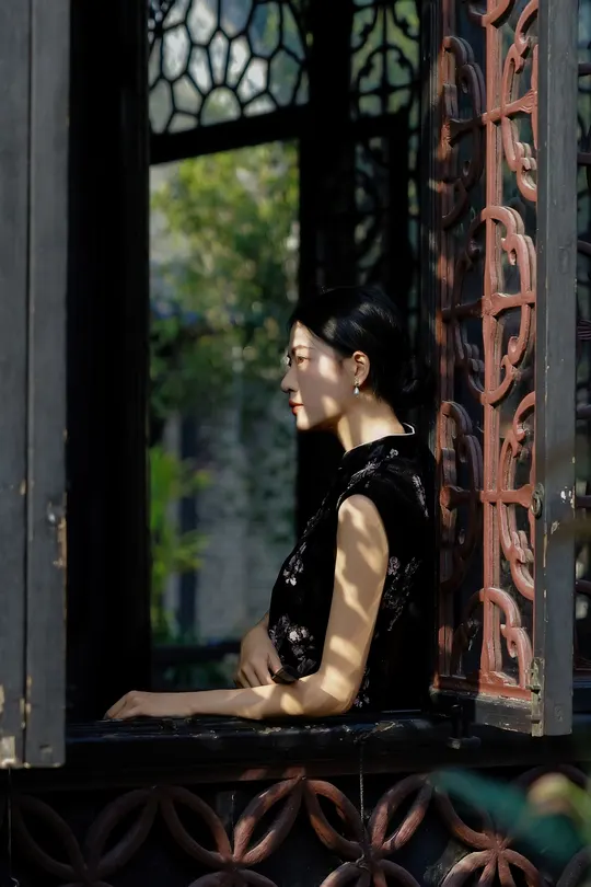 《寻香慢》 出镜:小羊 场地:余荫山房 一袭墨色旗袍,辗转于彩窗、 鱼缸与雕花木椅之间。 她用折扇、茶盏与静默的凝视, 在斑驳光影里完成一场与旧时光的温柔对谈。